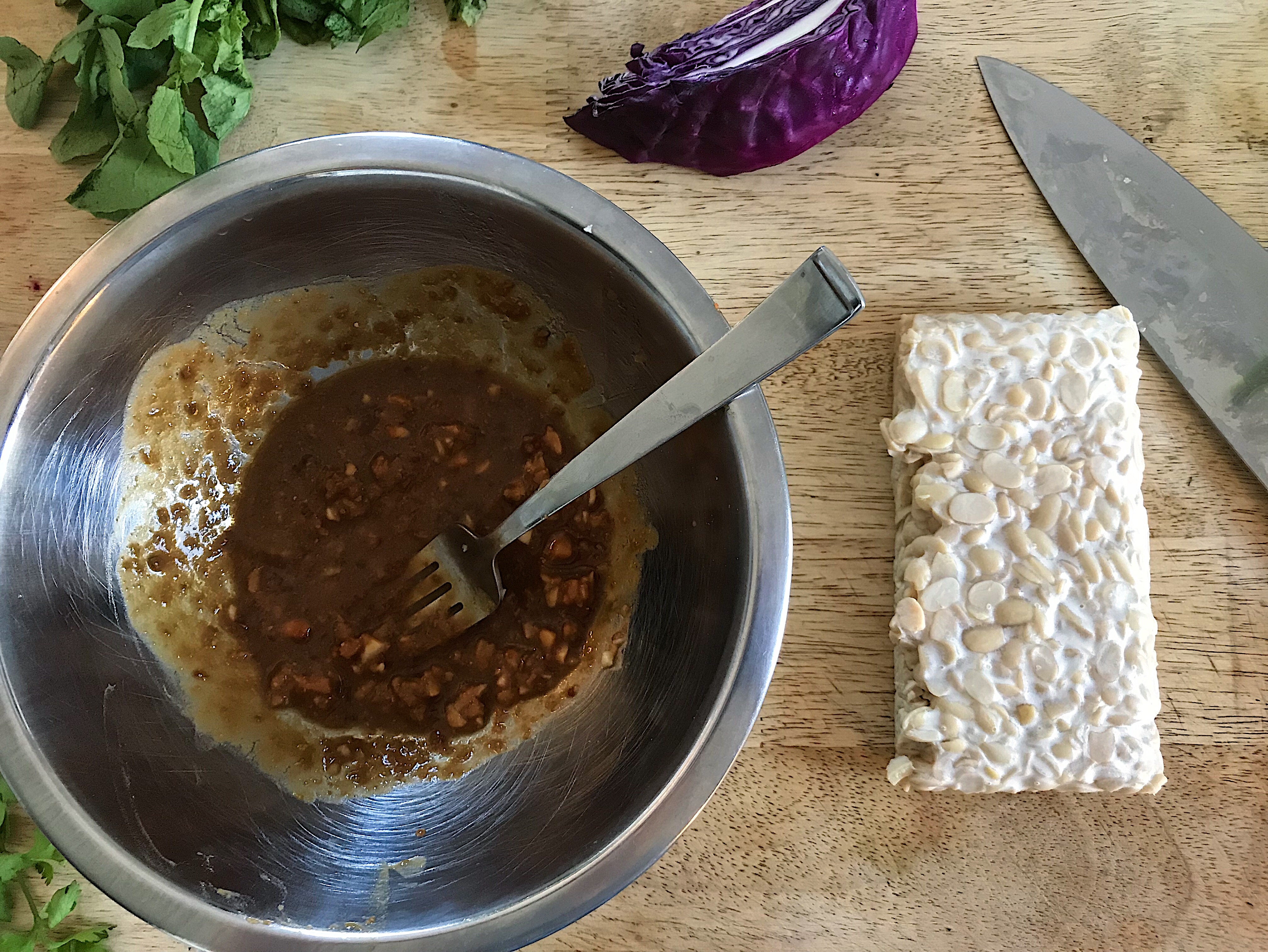 - Rincer le bol utilisé pour la marinade du tempeh et l’utiliser pour mariner le chou.