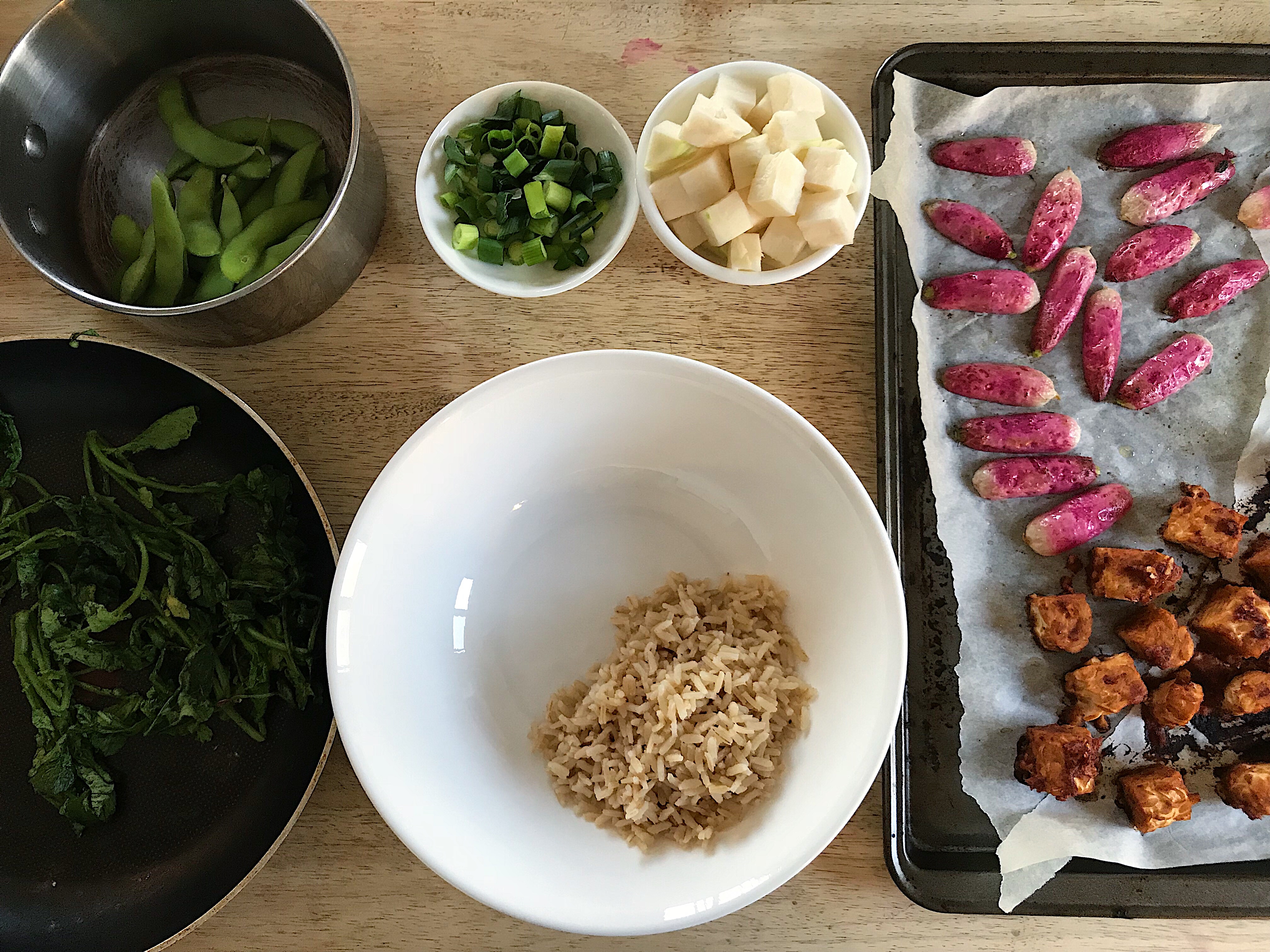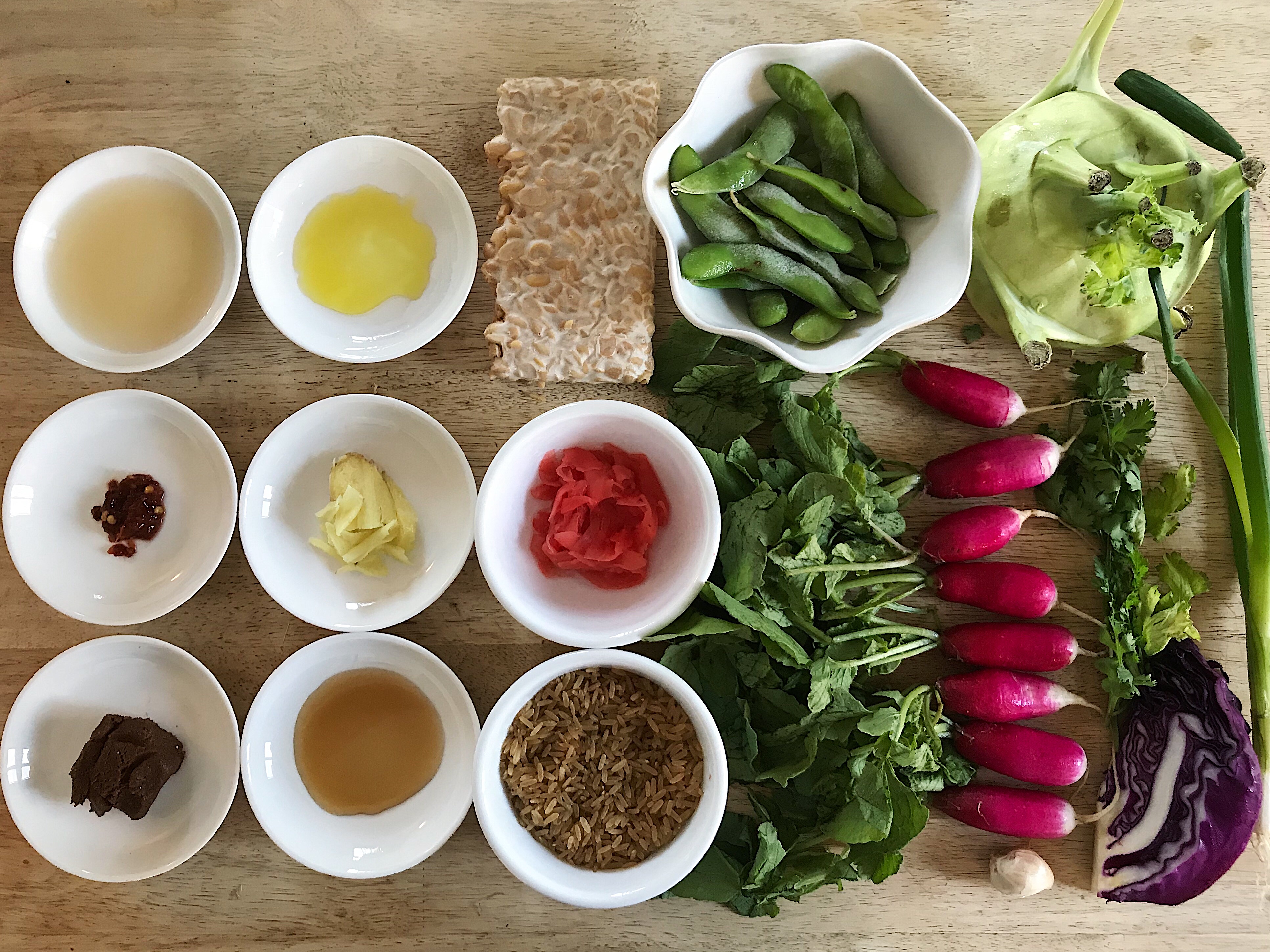 J’ai donc créé ce beau bol pour mettre en valeur deux de mes légumes d’été favoris, découverts l’an dernier lors de mes premières visites au marché. Il s’agit du chou-rave (ce légume vert-eau à la chair ferme et au gout délicat) et des radis français (plus allongés et plus doux que les radis traditionnels). Jumelés avec du tempeh et des edamames – deux excellentes sources de protéines – et du riz brun, ce plat est complet et équilibré (et riche en fer!). La fraîcheur des légumes crus et le sucré du tempeh et des radis grillés se marient à merveille avec le petit piquant des fannes de radis sautées et du gingembre mariné.
