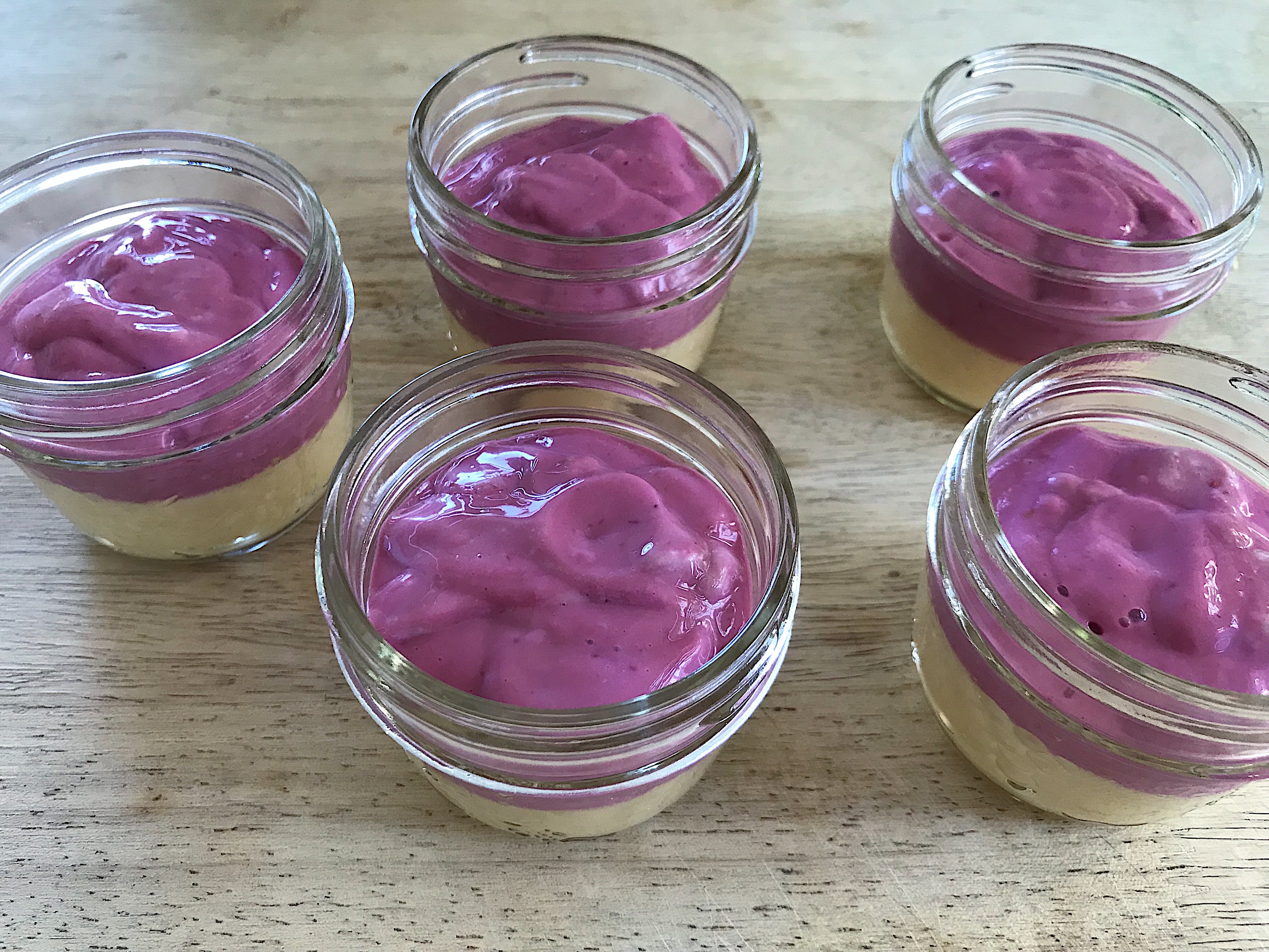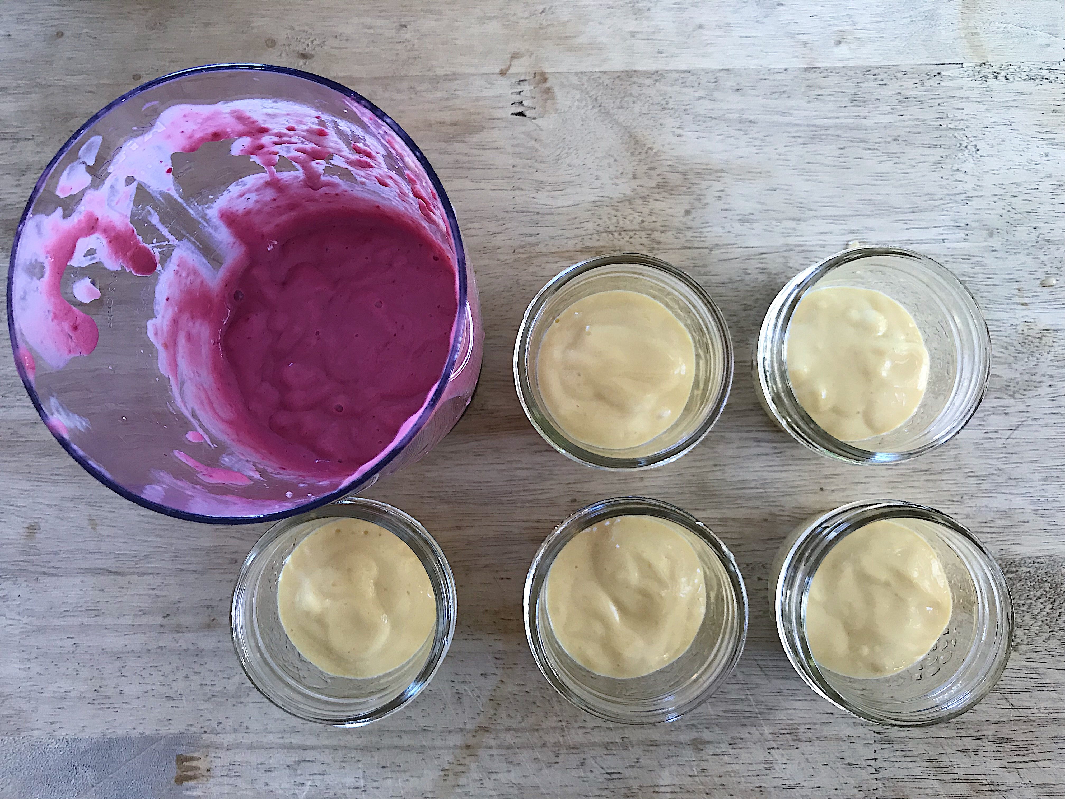 Rincer le bol et le pied mélangeur et répéter avec les framboises et le reste du tofu (150 g), du sirop d'érable (15 ml; 1 . à soupe) et du jus de citron (5 ml; 1 c. à thé). Verser doucement sur la mousse à la mangue.
