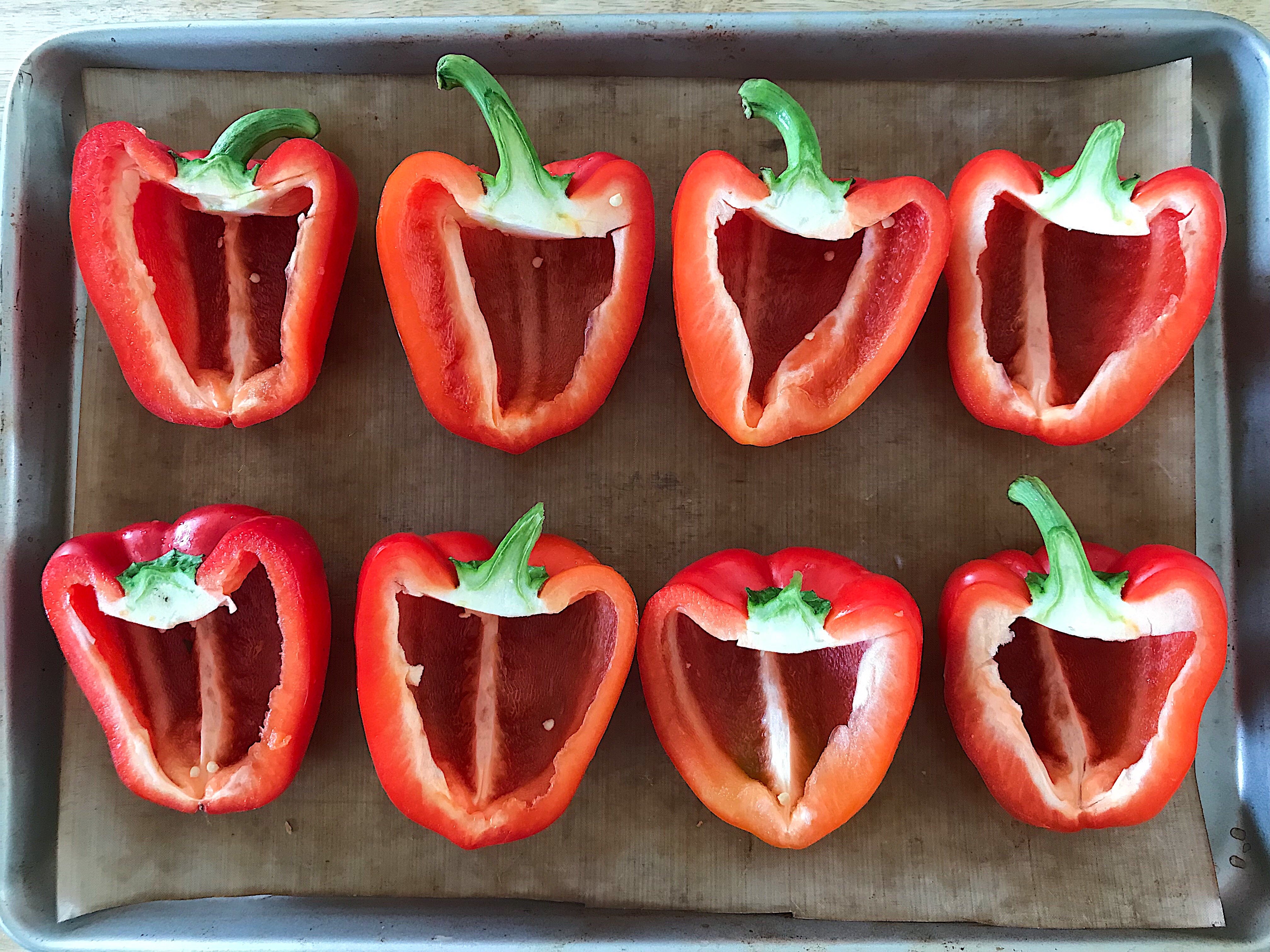 1. Placer la grille au centre du four et préchauffer à 200°C (400°F). Tapisser une plaque d'un tapis de cuisson réutilisable ou de papier parchemin. Couper les poivrons en deux verticalement et épépiner en taillant autour de la queue avec un petit couteau. Placer sur la plaque.